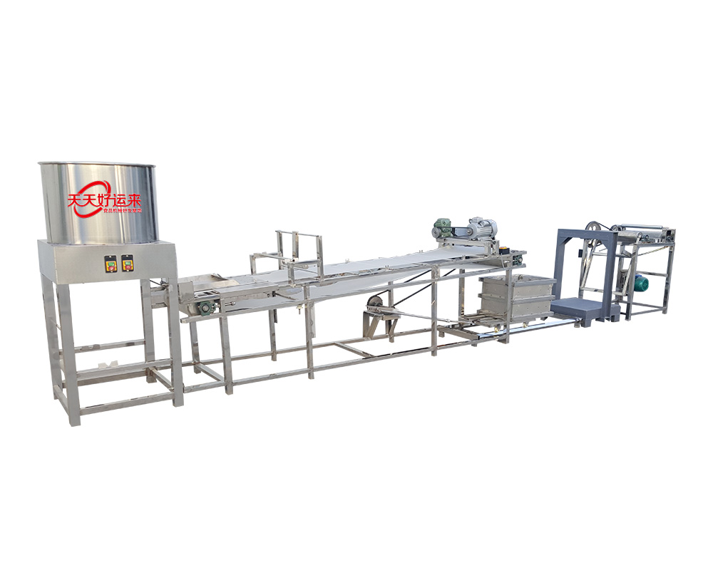 自動豆皮機(豆皮機、干豆腐、百頁、千張)生產線,是完成攪腦、潑腦、送料、折疊包布、以及壓皮、扒皮、卷包布等工序1-2人就可生產。大大的降低了勞動強度和提高了勞動功效。同時降低了成品生產成本。厚薄寬窄可調、口感勁道滑爽,完全和傳統生產的產品相媲美。本機特點:1、仿手工不改變手工的原色原味。2、占地面積小、操作簡單。3、用電量小,有220V和380V電源供選擇。4、分為90、100普通型和200、300標準型、400、600型工廠型、500仿手工適合做厚皮型。5,   便于清洗,使用壽命可到十年以上。